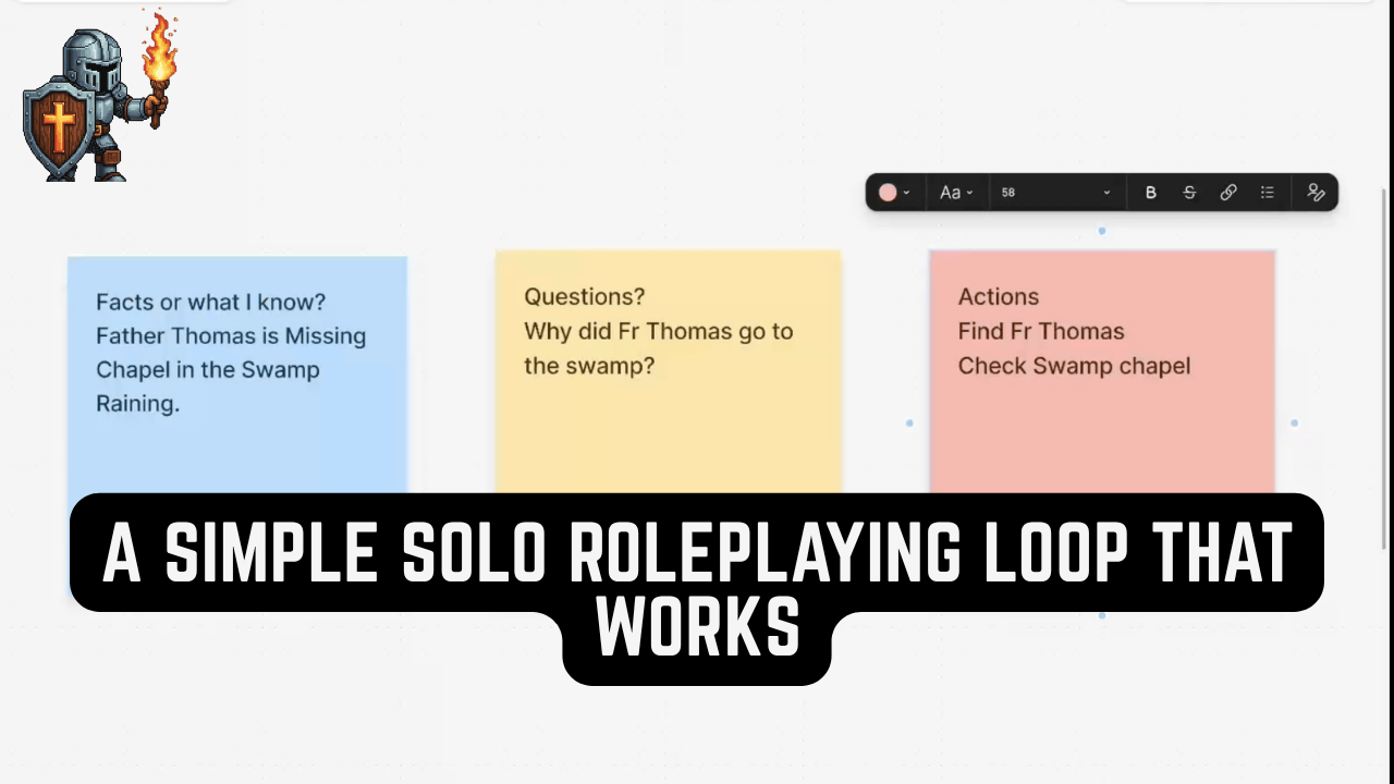 In this video, I walk through a simple solo roleplaying loop I use to keep play moving without getting stuck. I show how I set up my ideas visually, ask better questions, get clear answers, and turn those answers into action at the table.